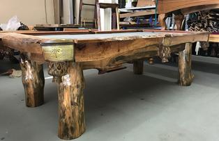 This table was built by scratch using live oak and pine. It is one of a kind table features Championship Tour edition cushions, live edge rails and matching wall rack. Will include delivery and setup and any color cloth. $8000